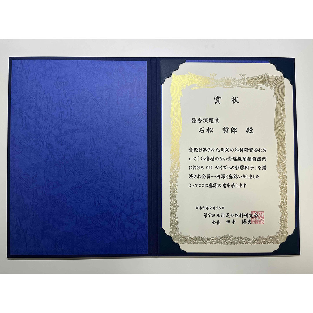 2023年2月25日に開催された第9回九州足の外科研究会において、教室の石松哲郎先生が優秀演題賞を受賞されました。おめでとうございます!!